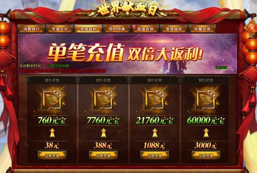 【活动内容】活动期间,单笔充值大于指定额度,即可领取双倍的充值元宝数!