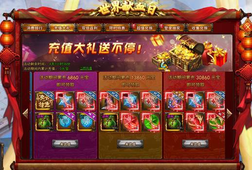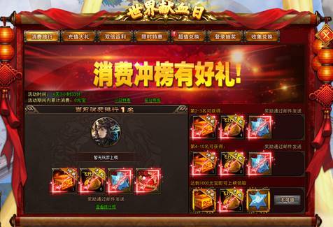 【活动内容】活动期间,消费越多礼越多,奖励拿到手哆嗦!消费1000元宝也可直接领取一份精美奖励!