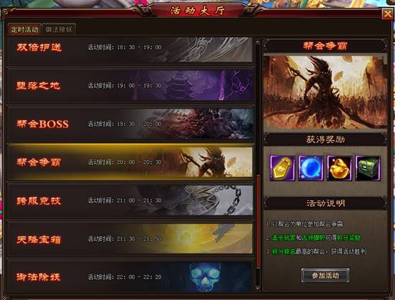 每周一、二、四、六、日20:00开启活动。活动开始后,会在界面右下方弹出提示面板,点击即可打开活动页面,也可通过“活动大厅→定时活动→帮会争霸”打开活动界面。
