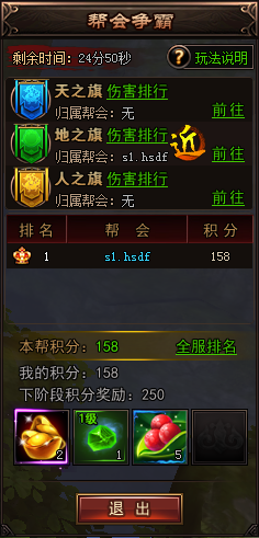 2.战场旗帜被摧毁之后根据帮会伤害排名,给予不同的积分