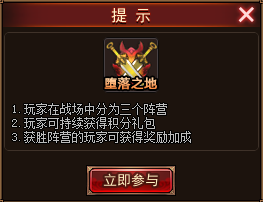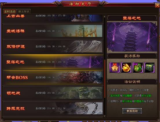 活动开始后,会在界面右下方弹出提示面板,点击即可打开活动面板,也可通过界面右上角“活动大厅→定时活动→堕落之地”打开活动面板。