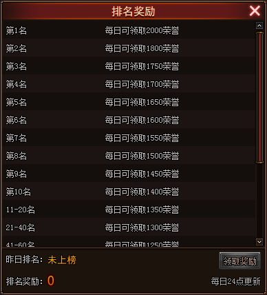 每个玩家每日可领取一次排名奖励。排名越高的,奖励自然越多!