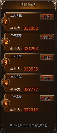 界面右边会显示当前竞技场排名前五的玩家,您只要进入前一百名就可以直接挑战他们了!
