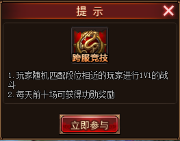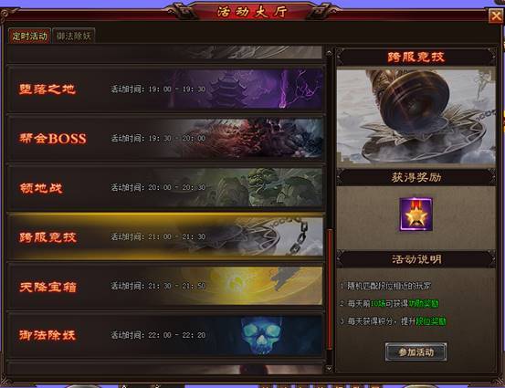 每天21:00-21:30跨服竞技场开启,点击右上角“活动大厅→定时活动→跨服竞技”或“战场大厅→跨服竞技”可打开跨服竞技的面板;或者点击界面右下角的提示面板亦可进入跨服竞技面板。