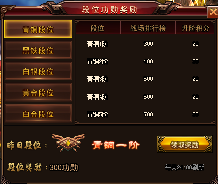 每个玩家每日可领取一次排名奖励。排名越高的,奖励自然越多!