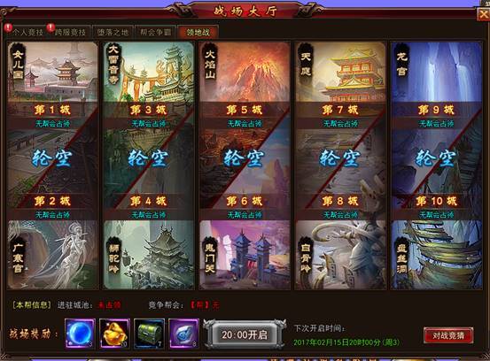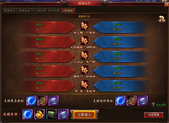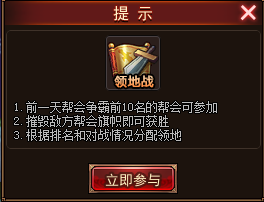 1.领地战开启之前,在对战帮会决定之后玩家都可对同一城的争夺帮会进行胜者竞猜,无论竞猜正确还是失败都会有丰厚奖励