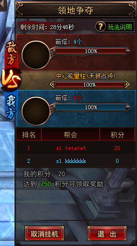 2.活动结束时,若帮旗还未被摧毁,则帮会积分较高的一方获胜