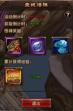 主城禅悟活动期间,玩家只要在主城安心打坐,便可获得大量经验以及奖励。活动时间有限,禅悟要抓紧!