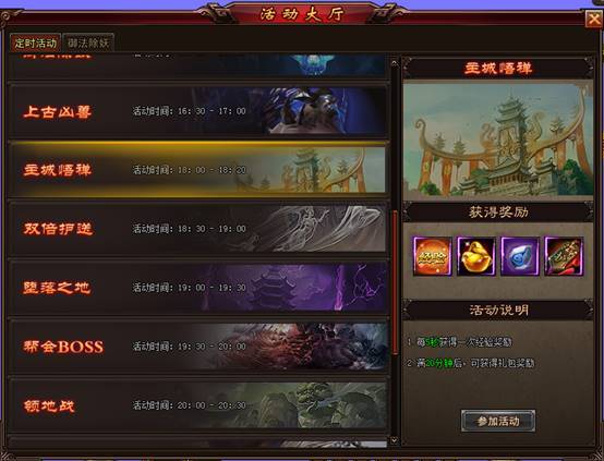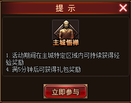 “主城禅悟”为每日定时活动,活动开启时可通过界面右下角的活动提示面板进入活动界面。或者点击界面右上方的“活动大厅”,在活动大厅直接点击定时活动中的“主城禅悟”然后点击“参加活动”,便可进入主城。