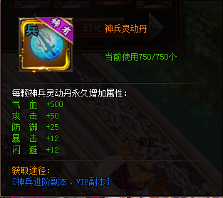 3. 神兵每成功进阶都可获得更高战力,更威猛外型,神兵阶数越高,所能使用属性丹最大数量也越高。