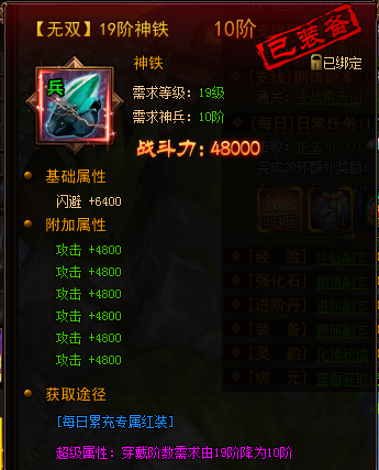 3. 神兵装备分为绿色,蓝色,紫色,金色,红色等品质,品质越高带来属性加成越高。