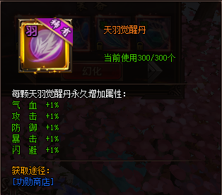 天羽达到一定的阶数之后,可使用天羽灵动丹、天羽觉醒丹、天羽飞升丹来增强天羽的战斗力!