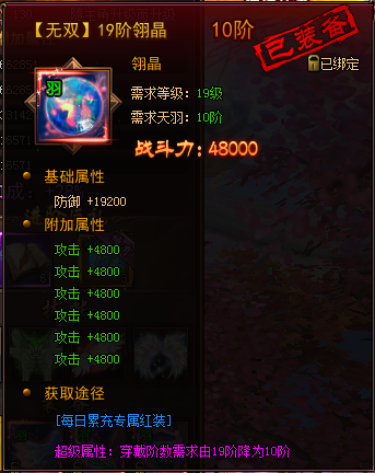 3. 天羽装备分为绿色,蓝色,紫色,金色,红色等品质,品质越高带来属性加成越高。