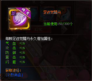 足迹达到一定的阶数之后,可使用足迹灵动丹、足迹觉醒丹、足迹飞升丹来增强足迹的战斗力!