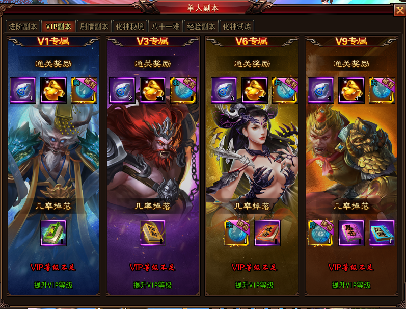 达到副本要求的最低VIP等级后即可点击界面右上角的“单人副本”,点击进入VIP副本,极品道具,等您来拿!